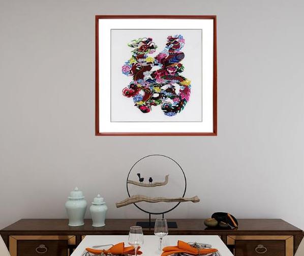 这幅餐厅画手工刺绣装饰画龙凤福,整体画面是一个大大的福字,而福字是用龙和凤的形象构成,像极了龙凤接吻,字体样式奇特,是字也是画,竭尽形象之妙。在中华传统民间吉祥图案中,龙凤是拥有非常好喻意的一种,手工刺绣装饰画龙凤福挂在餐厅墙面之上,龙凤各居一半,周边福云围绕、繁花似锦朵朵,一派和谐之气。