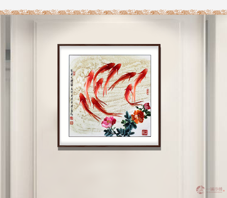2、选择寓意好的餐厅装饰画。比如这款手工刺绣装饰画九鱼图,九鱼图有万事如意寓意,自古以来“九”就会有长期之意。“鱼”则为万事大吉。九条讨人喜欢的锦鲤鱼在水中嬉戏,寓意着长期的万事如意。与此同时红色的鱼有旺运之说,黑色的鱼有驱邪之说。红、黑二种鲫鱼,预兆着财源广进,八面玲珑。