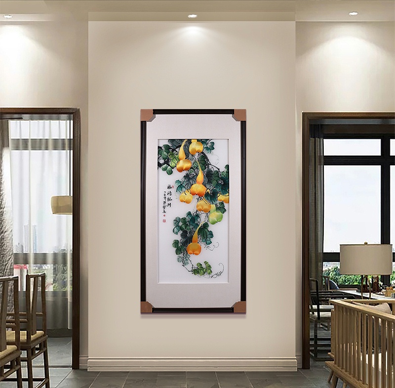 这幅手工刺绣玄关画,画中五只葫芦恣意烂漫,色彩灿烂而热烈。其形喜人,犹似如意;口小腹中大,寓意广纳财源,广接福气;更有藤蔓缠绕,象征多子多福,硕果累累,整幅作品色泽璀璨,给人眼前一亮的美感,挂在进门玄关繁茂吉祥,福禄双收。