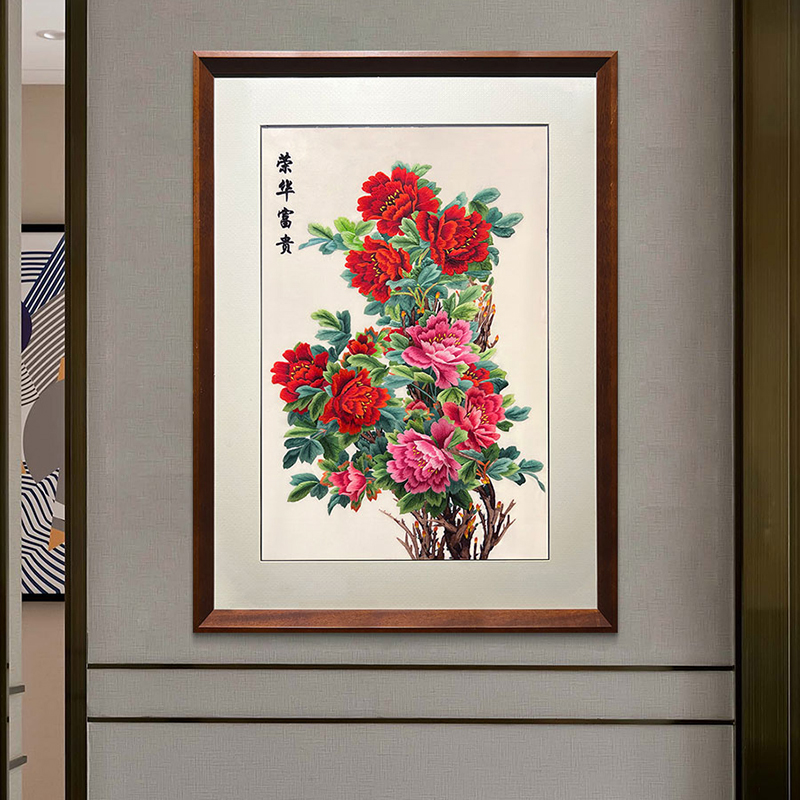 ,绣娘拆分蚕丝至极致,以平针绣、乱针绣交替,让花瓣层次分明、色彩渐变如真花绽放,家中玄关悬挂刺绣画,不仅能瞬间让玄关成为焦点,更寓意着富贵圆满,生活美好。