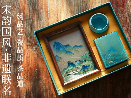 商务礼品定制送客户伴手礼节日礼品刺绣千里江山摆件茶叶茶具套装礼盒